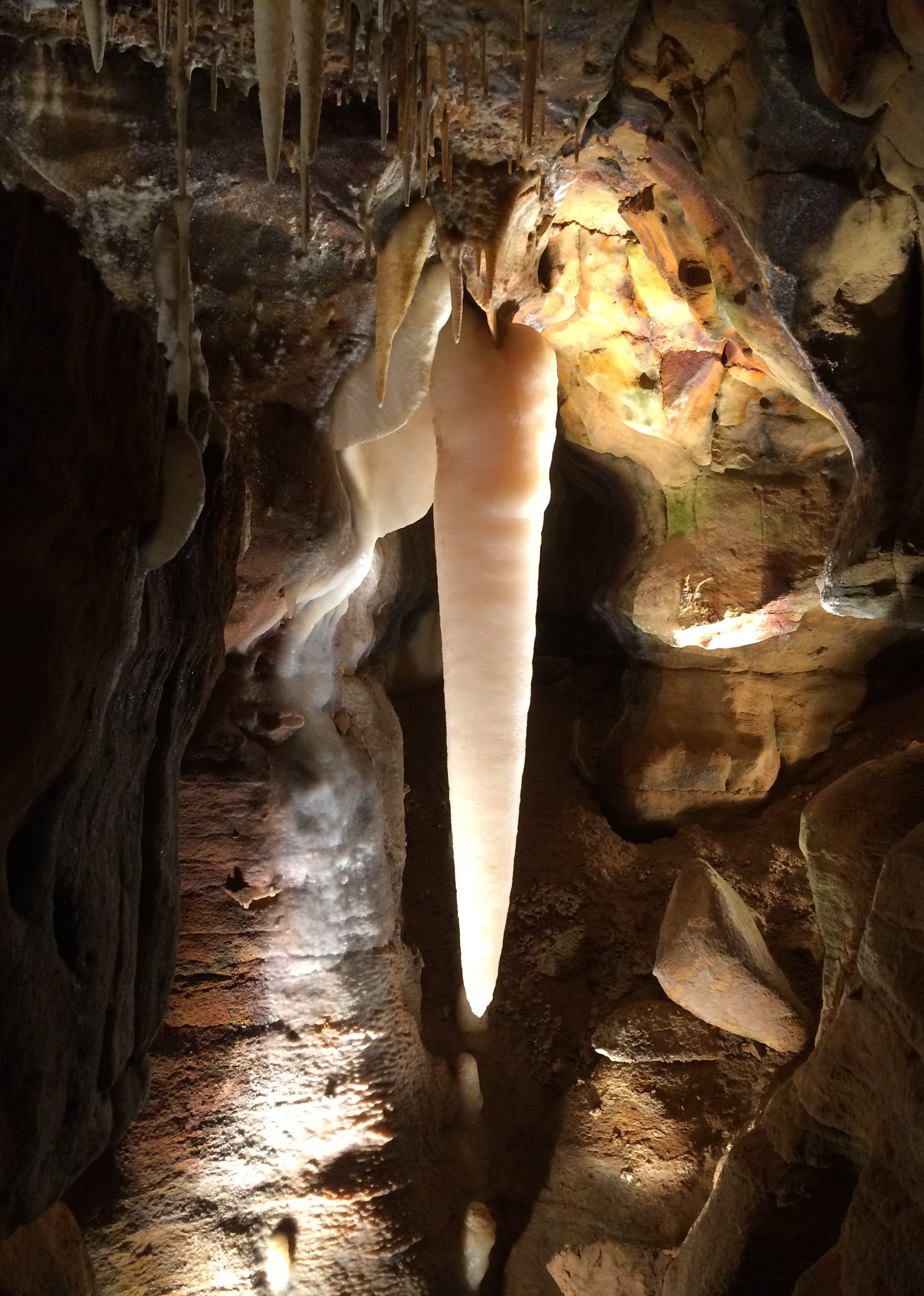 The second tour we took was the Natural Wonders tour. There was ample lighting present which served to highlight the variety of colors within the formations. The calcite stalactites and stalagmites were the brightest white that I’ve seen in any of the caves I’ve visited so far. One, named the Crystal King (see rig, was particularly impressive. The Crystal King is bright white and is said to be one of the largest and most perfectly formed stalactites to be discovered. Ohio Caverns are also the only ones in North America to contain “dual formations”. Dual formations occur when one mineral formation grows on another formation that has a different chemical composition. Those in Ohio Caverns are iron oxide formations that calcite has grown on.